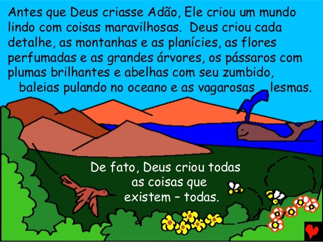 Ele fez o mundo em 6 dias e no sétimo descansou.Primeiro dia: Criação do dia e da noite. Segundo dia: Separação entre águas e céus Terceiro dia: Formação de terra seca em meio às águas que chamou de mares. E na terra seca fez nascer árvores frutíferas, ervas e toda sorte de vegetais. Quarto dia: Criação do sol, da lua e das estrelas. Quinto dia: Criação dos animais aquáticos e aves. Sexto dia: Criação dos animais terrestres e do homem. Sétimo dia: Descansou de toda a sua obra, que Deus criara e fizera.